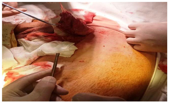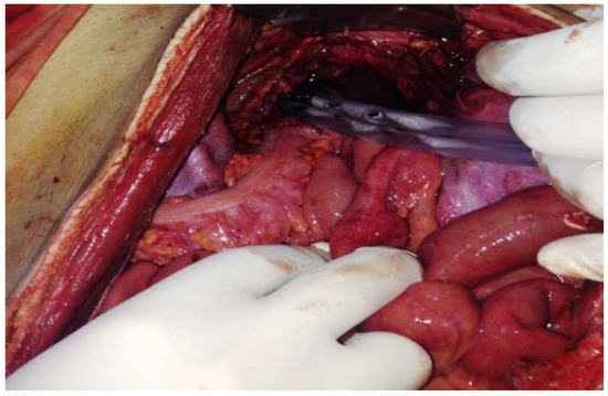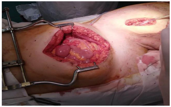 As far as the surgical intervention is concerned, the surgical plan was decided and established after the diagnosis was defined, the specific drug therapy being with albendazole. The objectives of the surgical intervention were the complete and total excision of the cysts (in cases of multiple localization) or, when the ideal cystectomy can be performed: the inactivation of the parasite, the evacuation of the cyst cavity, the elimination of the germinal membrane and the prevention of the intra-operative dissemination of parasites. Complete and total radical cystectomy (in cases with multiple localization) was performed in 4 patients, and pericystectomy and drainage of remaining cavities in 2 patients. All surgical interventions were performed through median laparotomy under orotracheal intubation (Figure 10 and Figure 11).