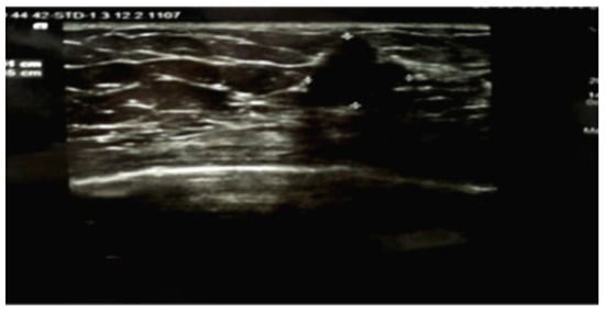 Bilateral mammography identified breasts with predominantly adipose tissue structure and symmetric appearance, without suspicious microcalcifications. In the right breast gland, a posterior nodular opacity with unclear contours was visualized (Figure 2).