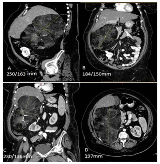 Abdominal computed tomography scan demonstrating a 25 cm x 17 cm x 21 cm, mass in close contact with the right hepatic lobe, the inferior vena cava, the ascendant and transverse colon, and the diaphragm, and a medially and inferiorly displaced right kidney.