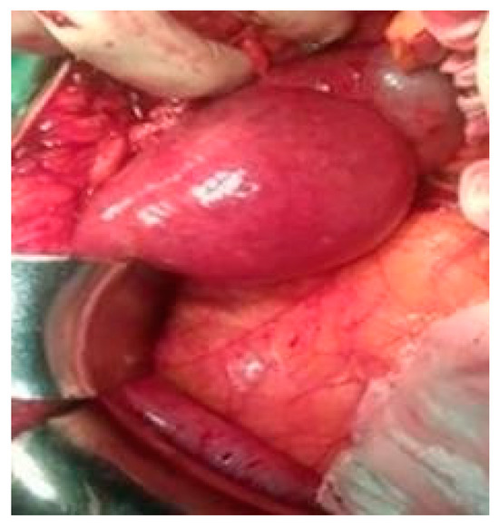 The preferred surgical approach in most cases was open surgery [14], only one case was resolved by laparoscopic approach. In 12 cases, a medial subxiphoid-suprapubic incision was performed, and in 2 cases a Kocher incision was preferred. In our case a medial subxiphoid-pubic incision was performed (Figure 2).