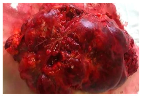 The surgical approach also included a retrograde cholecystectomy. The mass was dissected from the upper pole of the right kidney, the right hepatic lobe and the inferior vena cava. Gross examination revealed a thin encapsulated mass with firm, mixed consistency (Figure 3).