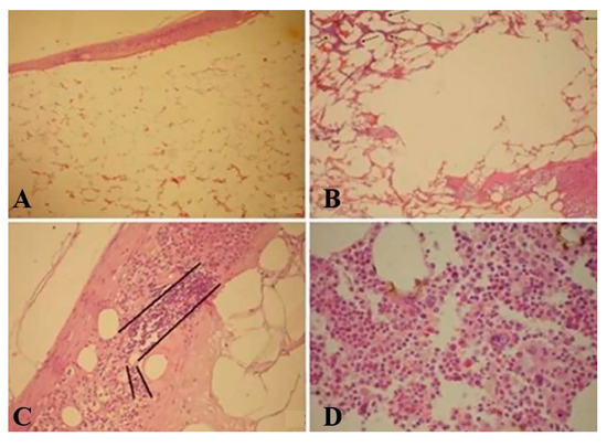 Microscopic view; Hematoxylin and eosin stain of the resected tissue. A: Overview of the tumor (magnification x4). Mature adipose tissue, many capillaries and cortico-adrenal gland capsule. B: Overview (magnification x10): Mature adipose tissue and many hematopoietic sites. C: Detail (magnification x20): Hematopoietic site under the corticoadrenal capsule. D: Detail (magnification x40): Hematopoietic tissue with all blood forming cells.
