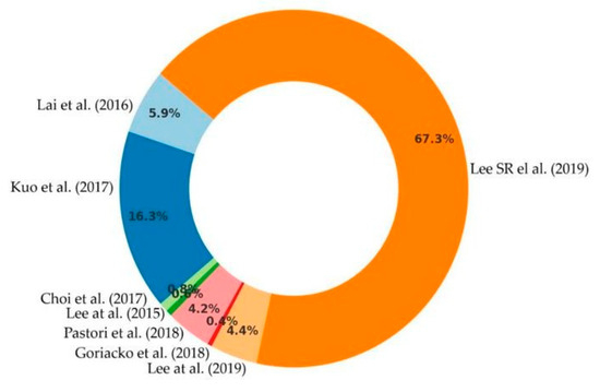 The pie chart in Figure 1 illustrates the distribution of participants across the different studies selected for this review. The largest proportion of participants, 67.3%, is from the study by Lee SR et al. (2019) [32], indicating this study had a much larger sample size compared to the others, which suggests it might have higher statistical power and more generalizable results. Kuo et al. (2017) [26] follows with 16.3% of participants, making it the second-largest study in terms of sample size.