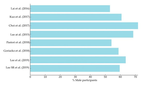 The bar chart in Figure 2 displays the percentage of male participants in the selected studies. It can be seen a relatively high representation of male participants, ranging from around 53% to 75%.