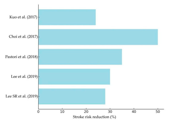 Figure 4 shows the stroke risk reduction, with varying percentages of risk reduction achieved by different treatments. Choi et al. (2017) [27] demonstrates the most significant stroke risk reduction at approximately 50%, indicating a strong protective effect of the intervention studied. Other studies, such as Pastori et al. (2018) [29], Lee et al. (2019) [31], and Lee SR et al. (2019) [32], show moderate reductions in stroke risk, ranging between 25% and 35%. Kuo et al. (2017) [26] reports the lowest stroke risk reduction, at around 24%.