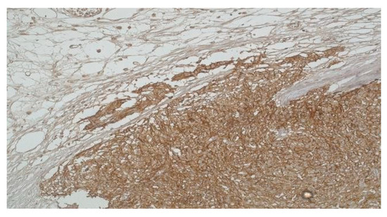 Figure 4. High-risk Gastric GIST with infiltration into the subserosal adipose tissue (DOG-1 x 20).