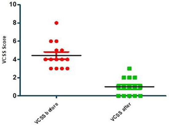 Compared statistical analysis of VCSS before and 1 year after treatment is shown in Figure 2 and Table 4, as presented below.