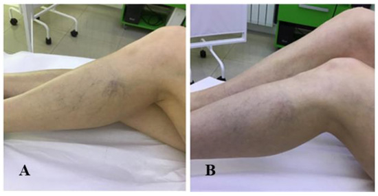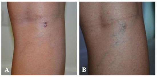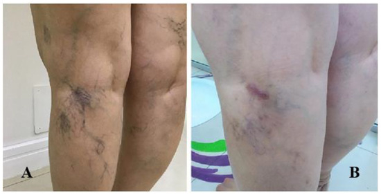 (A) Patient 2—Before treatment; (B) Patient 2—2% polidocanol, (1 vial), 0.5% (2 vials), 1 session (one month after treatment).