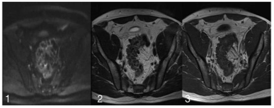 Among all patients included in the study, MRI detected suspicious images in three cases. In two patients, the MRI interpretation provided was inconsistent with the CECT images. In the first of these two cases, MRI formally excluded the existence of a neoplastic niche, even though CECT images were highly specific for such a scenario; in the other case, MRI highlighted an evocative aspect of an expansive process of the sigmoid, where the scanner did not find suspicious processes. The images below show the morphological and signal characteristics that allowed radiologists to hypothesize for malignancy (Figure 3).