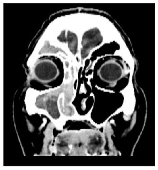 CT showed complete fluid and parafluid accumulation in the right maxillary sinus, with medial sinus wall resorption and antero-lateral walls osteosclerosis, extension of the inflammatory process through the right ostiomeatal complex at the ethmoid cells level as well as at the right frontal sinus level which was completely occupied; this was accompanied by discrete iodophilic right nasal polyposis and thickening of the mucosa at the right sphenoidal sinus level (Figure 2 and Figure 3).