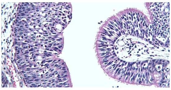 IP etiology is yet unknown. Certain hypotheses have been suggested, but causality has not yet been established for the suspected factors: smoking, allergy or certain occupational exposures [4]. Recurrence and carcinomatous potential have suggested viral origin for many years. An implication of Epstein–Barr Virus (EBV) has been studied, but inconclusively [2]. For more than 30 years, human papilloma virus (HPV) has been suspected of playing a major role in the pathophysiology of IP, but literature data remains contradictory. The main studies and meta-analyses of recent years show HPV rates varying between 17% and 38%, with ranges from 0% to 70% in individual series [7,8,9]. HPV integration in the cell genome induces overexpression of oncoproteins E6 and E7, which deactivate cell-cycle regulators such as p16, p21, p27, p53, cyclin D1 or retinoblastoma (Rb) gene protein [10,11], of which p53 and p21 have been most widely studied. According to several reports, p53 is found in IP associated with carcinoma and not in benign IP or healthy mucosa [8,10].