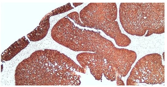 Diffuse positive CK5 in squamous and transitional epithelial areas, x100.