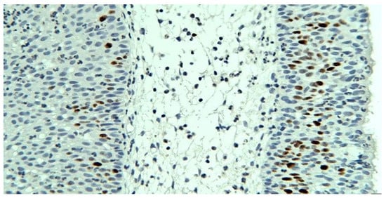 Ki67 immunolabeling - nuclear markers, positive predominantly basally in the areas with squamous, transitional or respiratory epithelia, with an average proliferation index of approx. 10%. In the scaly areas, there was a focus of areas with a proliferation index higher than the average (25% in the hot spot), with the tendency of markings towards the intermediate layers (Figure 9).