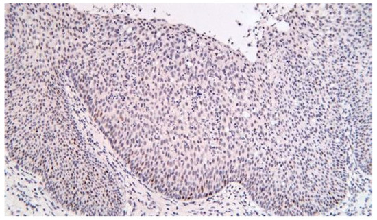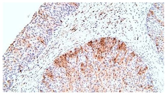 In the present case, p53 immunolabeling reveals a low presence of it (in less than 10% of the cells), more frequently in the case of squamous epithelia (tissue with more pronounced turnover), a fact that correlates with an increased potential for malignancy.