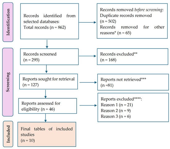 A total of 888 citations were retrieved after scanning the database above. After eliminating duplicate entries and excluding 65 items that did not satisfy the search parameters, the list was reduced to 295 remaining articles. A total of 168 studies were excluded from consideration as they did not meet our research requirements based on their abstracts. Additionally, 81 papers were further eliminated because they needed to address the specific question of this study. Furthermore, 21 studies were excluded due to the unavailability of the full text. Another nine studies were omitted because they focused on the wrong age group. Lastly, 11 articles were disregarded as they were written in a language other than English. Thus, we based our final analysis on ten search results that met the criteria for our investigation.