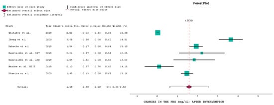 Whitaker et al. [] showed a minimal effect size of 0.03 with a CI crossing zero (0.03 ± 0.03), indicating no significant change in FBG levels post intervention. This result is reflected in the p-value of 0.33, suggesting a lack of statistical significance.