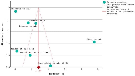 Most studies cluster around the overall effect size estimate of 1.58, indicated by the red diamond at the bottom of the plot. This central tendency reinforces the reliability of the overall effect size derived from the meta-analysis. Studies with larger sample sizes, such as those by Whitaker et al. [], Shamizadeh et al. [], and Debache et al. [], are positioned higher on the plot with lower standard errors, reflecting greater precision in their effect size estimates. Conversely, studies with smaller sample sizes, like those by Banitalebi et al. [] (S.I.T. and A + R) and Mendes et al. [], have larger standard errors and are positioned lower on the plot, indicating less precision.