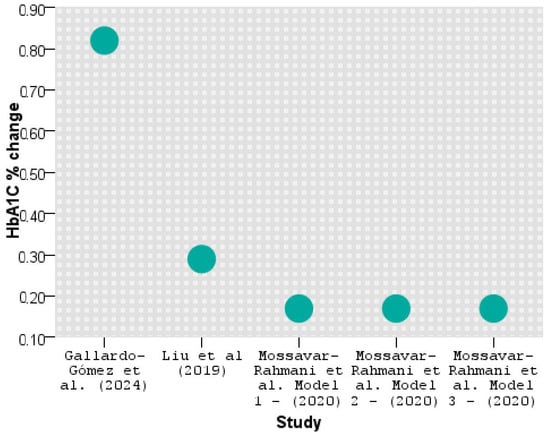 As seen above, Gallardo-Gómez et al. [] significantly improved HbA1C by lowering the hemoglobin glycation by 0.82%, followed by Liu et al. [] with 0.29%. The results are similar in all three models applied by Mossavar-Rahmani et al. [].