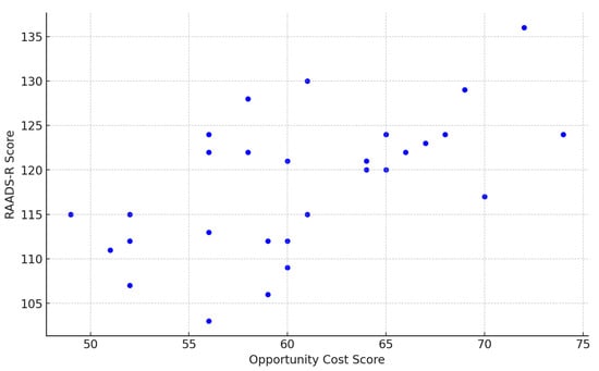 The correlational analysis between the opportunity cost questionnaire and the RAADS-R scores shows a Pearson correlation coefficient of approximately 0.60, with a p-value of 0.0004 (Figure 1). This indicates a moderate positive correlation between the two sets of scores, suggesting that individuals who score higher on neglect of opportunity costs also tend to have higher RAADS-R scores, aligning with traits typically observed in the autism spectrum. In psychological studies, a Pearson correlation coefficient of 0.60 is generally considered to be a moderate to strong correlation [].