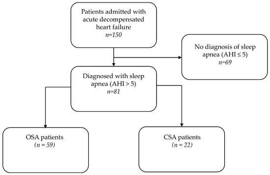 Flow chart of patient selection and classification. Patients admitted with acute heart failure (n = 150) were screened for sleep apnea. After diagnostic evaluation, 81 patients were diagnosed with sleep apnea (AHI > 5) and included in the study. Among them, 59 were classified with OSA and 22 with CSA. OSA—obstructive sleep apnea; CSA—central sleep apnea; AHI—Apnea–Hypopnea Index.