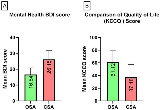 Comparison of mental health and quality of life between study groups. Panel (A) shows the BDI scores for mental health. The mean BDI score in the CSA group is 26.18 ± 5.5, compared to 16.64 ± 4.1 in the OSA group (p < 0.001). Panel (B) illustrates the KCCQ scores for quality of life. The mean KCCQ score is 61.12 ± 17.88 for the OSA group and 37.18 ± 19.98 for the CSA group (p < 0.001). OSA—obstructive sleep apnea; CSA—central sleep apnea; KCCQ—Kansas City Cardiomyopathy Questionnaire; BDI—Beck Depression Inventory.
