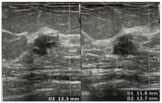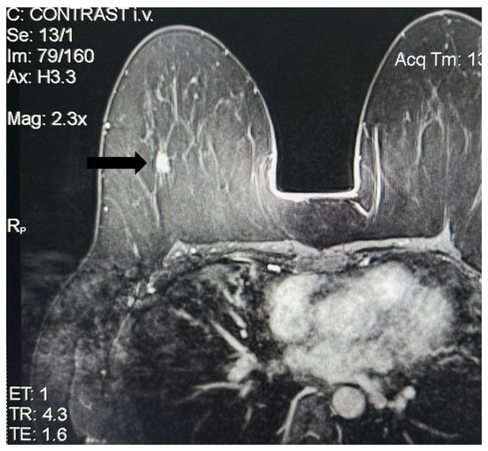 Eight years later, in May 2023, she presented her annual imagistic report where the following was described: abdomen and pelvic MRI—para-aortic left adenopathies with conglomerate aspect, the biggest measuring maximum 23/20 mm and 12/10 mm with features highly suggestive of an oncological process; breast ultrasound and MRI—right breast, supero-external quadrant, hour 10, at approximately 5 cm distance from the mammary papilla, the presence of a hypoechogenic nodule with microcalcifications, irregular margins, measuring 1.33/1.18/1.27 cm (Figure 1 and Figure 2).