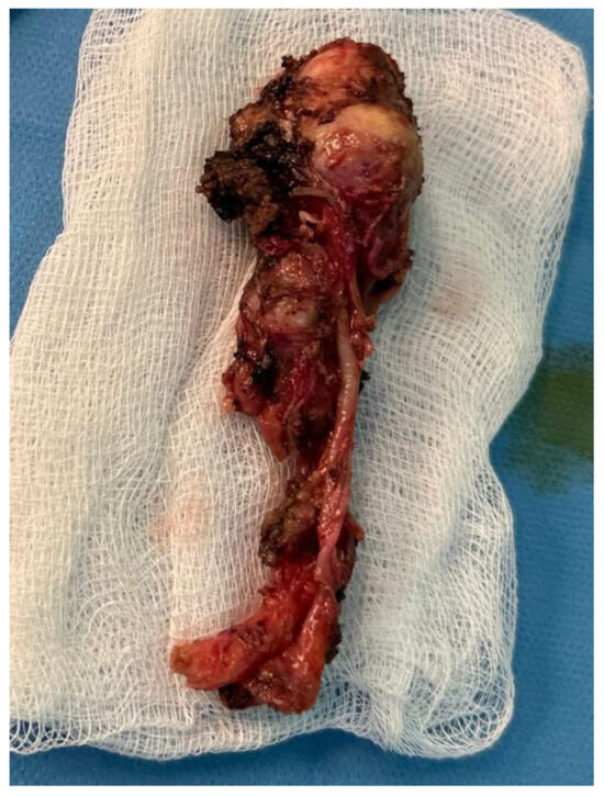 After presenting the case to the oncological board of the hospital, she was admitted to our department in July 2023 for debulking surgery under general anesthesia. Her blood pressure measured 126/76 mmHg at admission. The laboratory tests performed preoperatively showed normal hemoglobin and coagulation tests. Adequate bowel preparation and VTE prophylaxis were performed. Exploratory laparotomy revealed a large latero-aortic adenopathy exceeding the left vascular renal pedicle up to 5 cm above the emergence of the inferior mesenteric artery.