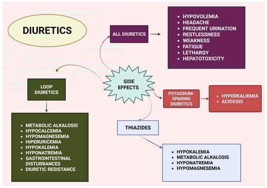 Overview of diuretic side effects. Created with BioRender (web application, accessed on 8 April 2025; BioRender Inc., Toronto, ON, Canada; www.biorender.com).