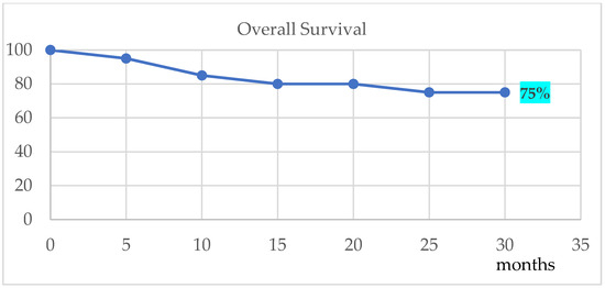 We also analyzed overall survival (OS) in 19 patients; one of them was lost from the follow-up and excluded from the OS analyzed. A Kaplan–Mayer survival curve indicated a 75% OS rate for our patients (Figure 1).