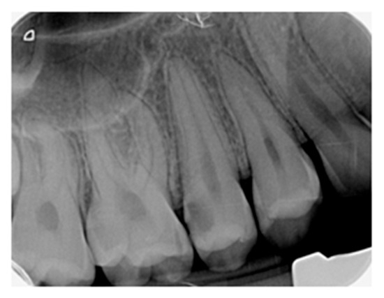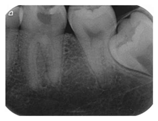 When the penetration depth of a carious lesion cannot be assessed clinically, in contrast, the radiographs illustrate two types of images, deep lesions and extremely deep lesions. A distinctive tait for deep lesions (Figure 2), which show a dentine demineralization extended pulp-ward round 3/4 of dentine thickness, is the presence of a higher radiodensity rim between the caries and pulp chamber compared to extremely deep lesions (Figure 3 and Figure 4), which are characterized by complete homogenous penetration without any tendency of increasing peripheral density [30].