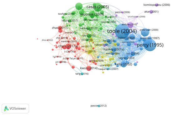 Bibliographic coupling, a method that connects two publications based on their citation of a common third source, was employed to identify overlapping research areas and concurrent themes in homocysteine studies. Unlike total citation counts, this approach delineates relationships between documents by analyzing shared references and highlights the interconnections between different facets of homocysteine research, particularly the foundational studies that continue to inform current investigations. Analyzing 233 documents, 175 items were found to meet a citation threshold of at least five citations, forming a major cluster composed of six sub-clusters. This network contained 7418 connections and achieved a Total Link Strength (TLS) of 15,448, providing a comprehensive view of the research landscape (Figure 1). In this network, the size of each node reflects its relevance, while the proximity of nodes indicates similarities in research focus. The lines connecting nodes represent the relationships between these topics.