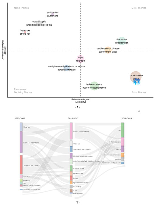 For keyword analysis using a thematic map, the Spinglass clustering algorithm was implemented in Biblioshiny, selected for its robustness and reliability in network partitioning. In Figure 3A, keywords are classified based on co-occurrence relationships, with the x- and y-axes representing the dimensionality reduction output of the network. Keywords in close proximity indicate stronger associations in the literature, whereas those positioned farther apart reflect weaker connections. This method facilitates an objective, data-driven classification of research themes [4]. Figure 3A further categorizes keywords into four quadrants based on their density and centrality: niche, emerging or declining, basic, and motor themes. The niche quadrant highlights specialized but less frequently occurring topics, such as “aminothiols”, “glutathione”, and “meta-analysis”. While these topics remain relevant, they represent a relatively narrower focus within the broader landscape of homocysteine research. In contrast, terms such as “risk factor” and “hypertension” fall within the motor themes quadrant, indicating that they are not only central to the field but also have widespread relevance, particularly in stroke risk assessment and prevention strategies. However, keywords such as “cardiovascular disease” and “case–control study” show less centrality despite their relevance. The emerging themes quadrant reveals growing interest in terms such as “methylenetetrahydrofolate reductase” and “cerebral infarction”. Similarly, “ischemic stroke” and “hyperhomocysteinemia”, positioned in the lower-right quadrant, suggest areas that could evolve into key research directions with further exploration. Interestingly, terms such as “folate” and “folic acid” are positioned between emerging and basic themes, hinting at their transition into more foundational areas of study. Meanwhile, keyword emergence for terms such as “homocysteine” and “stroke” demonstrates their high centrality, as marked by a sudden increase in usage over a short period. By mapping these thematic clusters, this methodology enhances the understanding of research trends and supports the identification of future directions in the field.