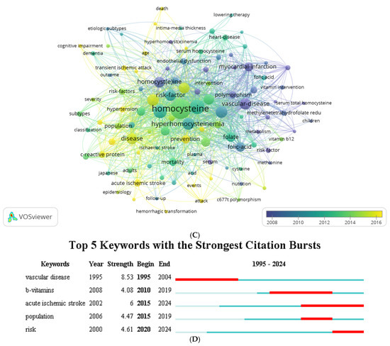 The keyword citation burst analysis using Citespace, with a five-year interval (Figure 3D), reveals key research hotspots and emerging trends in homocysteine studies. “Vascular disease” exhibited the highest burst strength (8.53), indicating its central importance in the research landscape, followed by “acute ischemic stroke” (6.00), “risk” (4.61), “population” (4.47), and “b-vitamins” (4.08). Notably, terms such as “vascular disease” and “b-vitamins” also maintained the longest burst durations, spanning up to 10 years, reflecting their sustained relevance in the field. In contrast, “population” was a focal point for a relatively shorter duration, from 2015 to 2019, suggesting more transient interest in demographic-related aspects. Likewise, emerging keywords such as “acute ischemic stroke” and “risk” have gained increasing attention. The prominence of these terms aligns with a growing emphasis on understanding stroke risk factors and interventions, suggesting that future studies may increasingly focus on the intersection of homocysteine levels, acute stroke management, and vascular disease prevention.