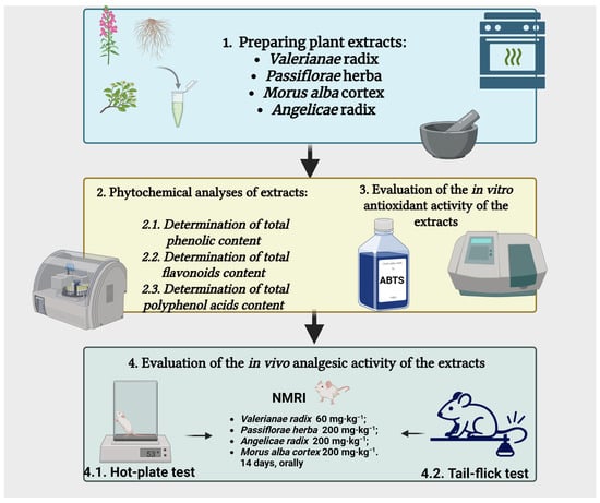 The experimental design, including extract preparation, phytochemical characterization, in vitro antioxidant testing, and in vivo analgesic evaluation, is summarized in Figure 1.