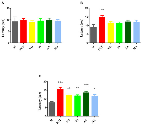 (A) Initial pain reaction latency in the hot-plate test. (B) Pain reaction latency in the hot-plate test after 7 days. (C) Pain reaction latency in the hot-plate test after 14 days. Values are expressed as mean ± S.E.M. M—control. * p < 0.05; ** p < 0.01; *** p < 0.001 vs. M. M—control group; PCT—paracetamol, 100 mg·kg−1; VO—Valeriana officinalis extract, 60 mg·kg−1; PI—Passiflora incarnata extract, 200 mg·kg−1; AA—Angelica archangelica extract, 200 mg·kg−1; MA—Morus alba extract, 200 mg·kg−1.