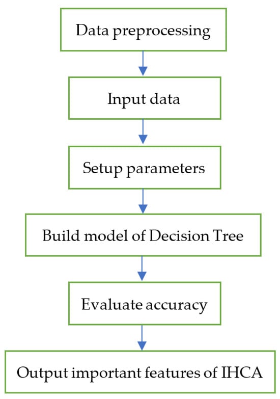 Section 3.2 to our IHCA data. Again, we consider patients’ personal characteristic variables, NEWS categories, and CCI comorbidity categories and the IHCA features include age, gender, smoking, drinking, BMI, body temperature, pulse, respiration, systolic blood pressure, diastolic blood pressure, CPR, ROSC, heart disease, diabetes, hypertension, chronic obstructive pulmonary disease, kidney disease, stroke, dementia, polyarthritis, gastric ulcer, cancer, and asthma. These variables will be used as classification features (splitting attributes) of the decision tree model, and IHCA will be used as the target variable (target attribute). When conducting machine learning analysis, these variables will be used to build a classification model that aims to predict whether a person will develop IHCA based on these features. In order to adapt these variables to the decision tree model, some categorical variables need to be encoded and converted in data preprocessing. For example, gender includes two categories: male and female, and smoking and drinking may have options of “yes” or “no”. In these cases, numerical encoding (such as 1 and 2) is usually used to convert them into numerical data (