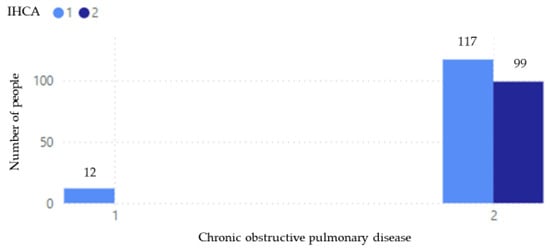 Figure 8 shows the relationship between COPD and IHCA mortality. The data show that among patients without COPD, 12 died after IHCA. In contrast, among patients with COPD, there were 117 deaths and 99 survivals after IHCA. From these data, we can observe that patients with COPD are not only more likely to develop IHCA, but their overall number of cases is also significantly higher than that of patients without COPD. This may be because the respiratory defense function of patients with COPD is weaker. Poor lung function makes it easier to develop infections such as pneumonia, and coupled with poor lung function, it is more likely to cause severe respiratory failure. However, among patients with COPD, the survival rate after IHCA is relatively high, which may be due to the higher awareness of medical staff for these high-risk patients and the fact that these patients have more complete care plans.