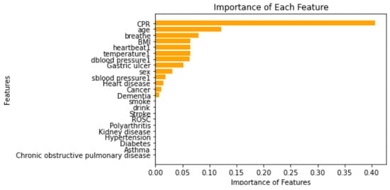 Figure 9 shows the importance of each feature in the decision tree model, sorted from high to low. It can be clearly seen from the figure that CPR is the most critical feature, and its weight far exceeds that of other features. Whether CPR is performed or not often plays a decisive role in the handling of acute events; the second most important factor is age, which is second only to CPR, indicating that age has a significant impact on the assessment of cardiac arrest risk; this is followed by respiratory rate, whose characteristic importance shows the key role of respiratory function in the risk of cardiac arrest. Problems such as dyspnea and abnormal breathing are often important precursors to acute cardiac arrest, especially in patients with heart failure, hypoxic shock, or complications of lung disease. Timely detection of abnormal breathing can provide early warning signals. BMI and body temperature are also considered important features by the model. BMI is an indicator of the patient’s body shape and nutritional status. Abnormal body temperature may be a manifestation of systemic disease or shock, which are usually potentially related to cardiac arrest. Therefore, BMI and body temperature occupy a certain position in the model, which also shows the warning value of these characteristics for acute risks; blood pressure is another important set of physiological indicators. The blood pressure value can directly reflect the patient’s cardiovascular function. In emergency situations, the real-time monitoring and analysis of blood pressure are of great significance for the prediction and prevention of cardiac arrest. The importance of gastric ulcer in the model is at a medium to low level. Although gastric ulcer is not a disease directly related to cardiac arrest, it may indirectly affect cardiovascular function through other mechanisms, thereby causing a low perfusion state and posing a potential threat to cardiac function. Gender also has a certain impact on the incidence of cardiac arrest. In emergency treatment, the impact of gender is often not the most direct decisive factor. This may be one of the reasons why the gender characteristics in the model are less important. From then on, although the contribution of characteristics with lower importance (such as chronic obstructive pulmonary disease, asthma, dementia, etc.) to the model is relatively small, they still have supplementary value in specific situations.