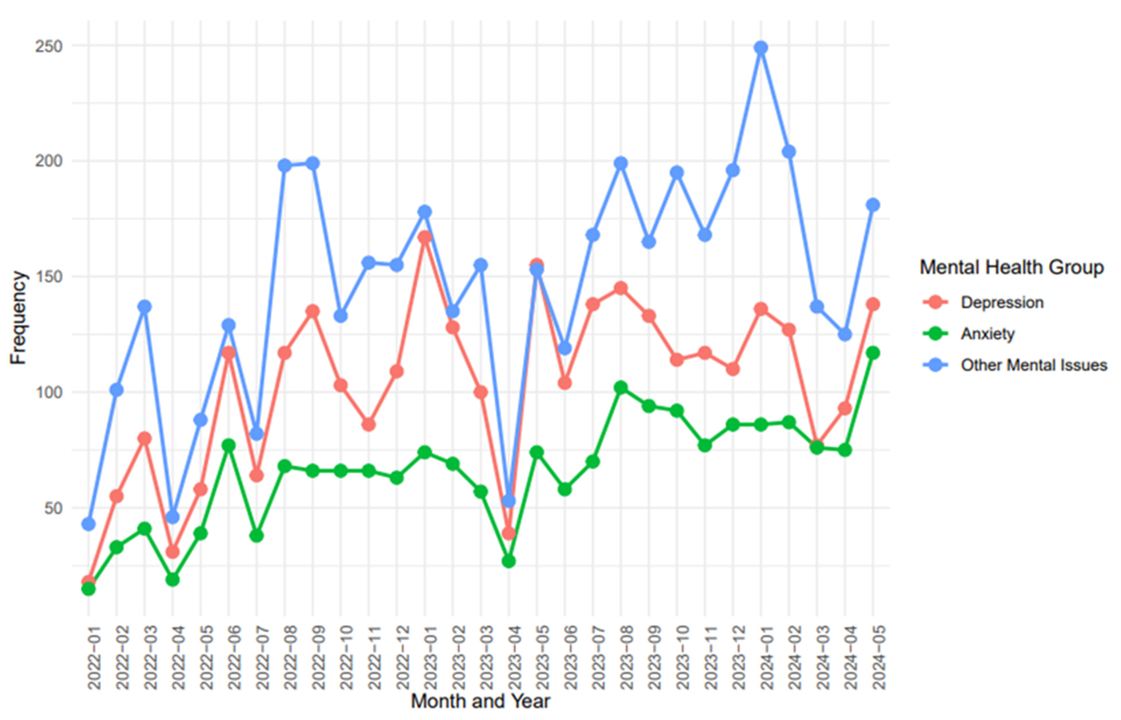 3.6. The Trend of Mental Health Disorders over Time