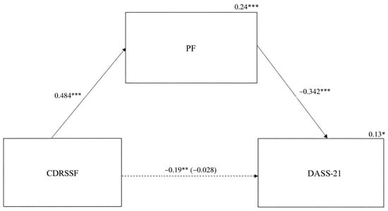 Final path model for the mediating effect of psychological flexibility on mental health. *** p < 0.001, * p < 0.05; CDRSSF = psychological resilience; PF = psychological flexibility; DASS-21 = depression, anxiety, and stress (mental health).