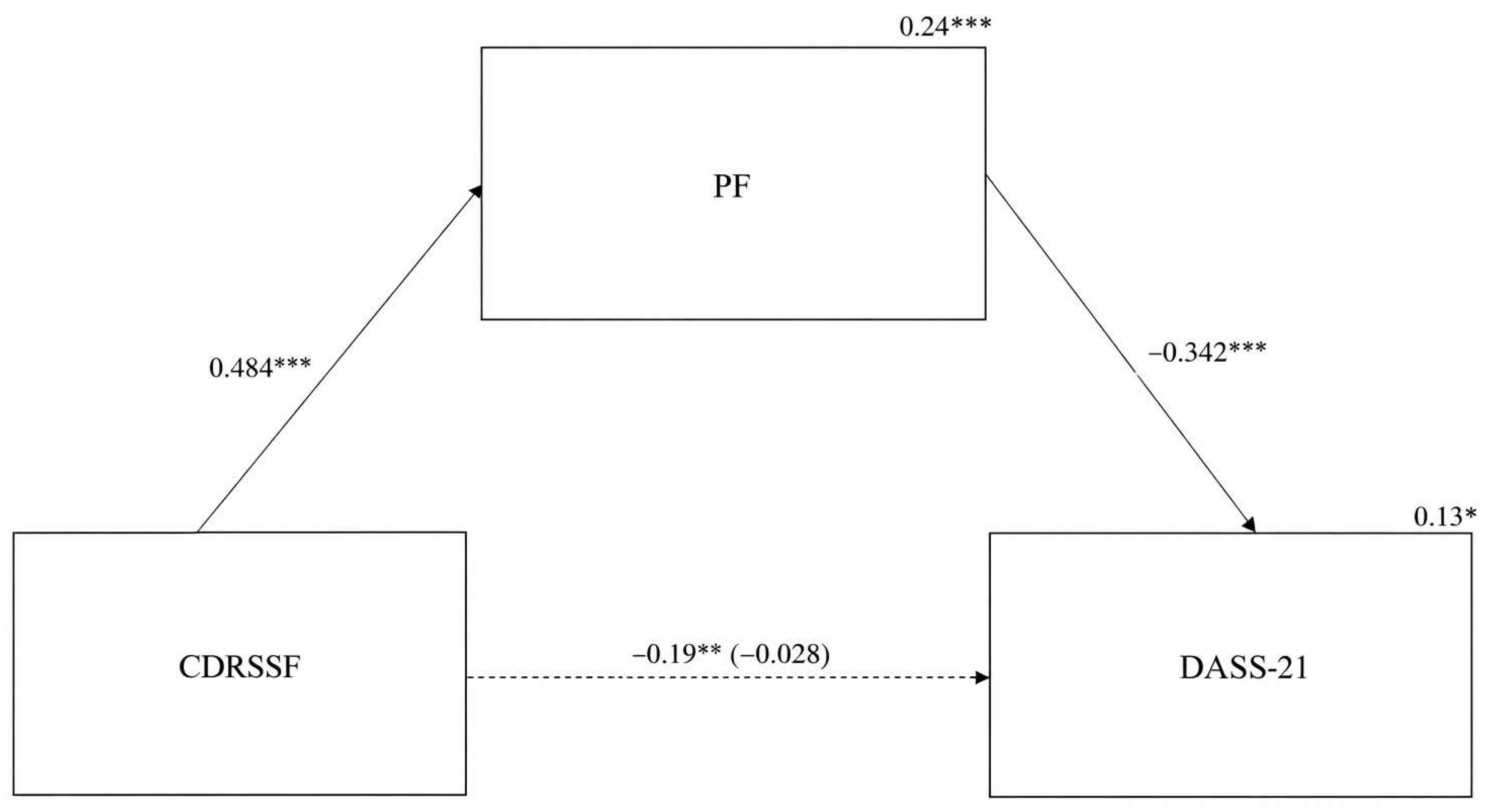 | CDRS → PF | 0.913 | 0.108 | 0.484 * | 0.235 | <0.001 | 0.700 | 1.126 |