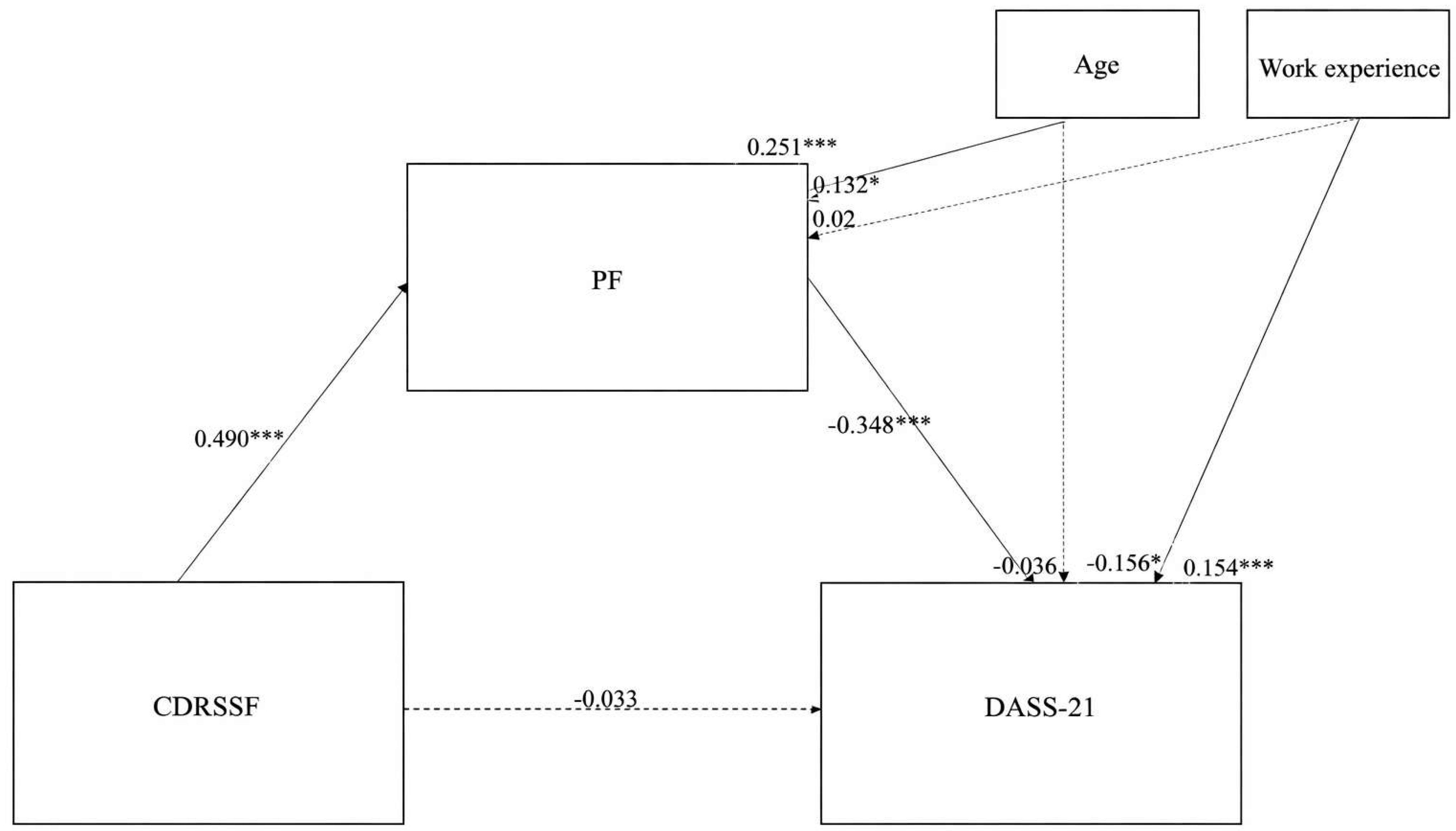 | PF → DASS | −0.284 | 0.058 | −0.342 * | 0.127 | −0.399 | −0.169 | |
