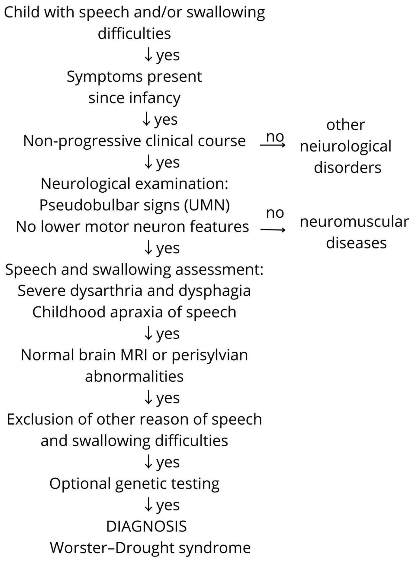 - Clark, M.; Harris, R.; Jolleff, N.; Price, K.; Neville, B.G.R. Worster-Drought syndrome: Poorly recognized despite severe and persistent difficulties with feeding and speech. Dev. Med. Child Neurol. 2010, 52, 27–32. [Google Scholar] [CrossRef] [PubMed]