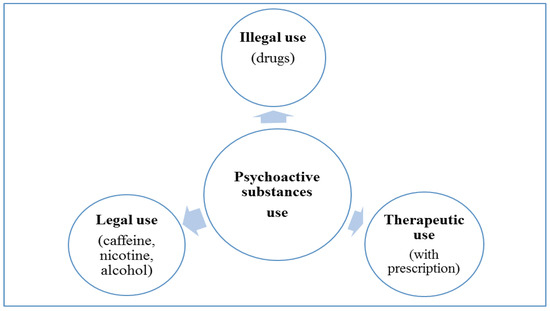 Psychoactive substance is defined as any substance which alters perception, behaviour, motor or cognitive functions [4]. It is emphasized that the term psychoactive does not necessarily imply dependence-producing. Together with its equivalent, psychotropic drug, the term psychoactive substance is descriptive for the whole class of substances, licit and illicit, of interest to drug policy. Some authors refer to psychotropic the drugs used primarily in the treatment of mental disorders (sedatives, anxiolytics, antidepressants, neuroleptics), while others apply the term to substance with abuse susceptibility, because of the effects on disposition or consciousness (stimulants, hallucinogens, sedative-hypnotics, alcohol). In the context of international control of drugs, psychotropic substances are those set out in the Convention on Psychotropic Substances (1971). In line with the socio-legal status of substances used, consumption of psychoactive substances can be classified into 3 categories (Figure 1).