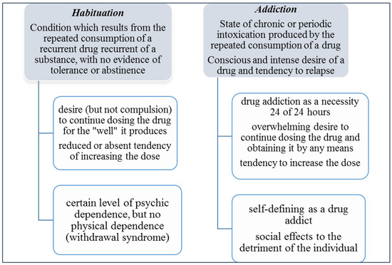 An official, unitary definition for addiction has been trying to give since 1931 by the Commission on Narcotic Drugs, and later by World Health Organization (WHO), in 1957, 1964 and 1969. Etymologically, the word "toxicomania" comes from the Greek language from toxikon (poison) and mania (madness); therefore "madness of poison" [5,12]. First official terms assigned to the toxicomania refer to habituation and addiction (Figure 2). The term “habituation” refers to the repeated use of a drug for a psychological desire (without the signs of tolerance or abstinence). The second notion suggests a vice, a bad habit; however, etymologically, the term addiction comes from Latin: addicere in the Roman law used to designate the relationship between two people in a debtor-creditor relationship; addictus was a slave coming from a debtor.
