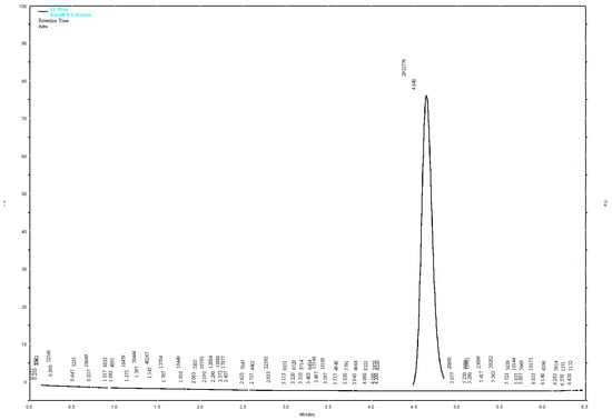 Given these results, we resorted to a mobile phase of acetonitrile and 0.1% formic acid, the proportions being determined by successive trials: 30:70 (TR = 2.25 min.), 25:75 (TR = 2 , 5 min.), 20:80 (TR = 4.65 min.). Based on these determinations, we selected a mobile phase of acetonitrile and 0.1% formic acid 20:80 (Figure 1).
