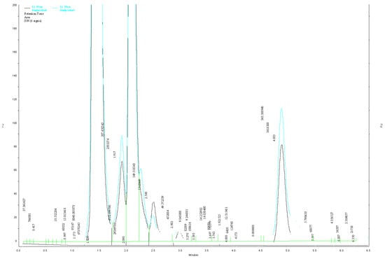 The precision of the method was determined as repeatability in the linearity study of the method. Based on the results (analysis report provided by the software Chromquest 4.1, data not shown), the method proved to be precise (RSD ≤ 2%). In addition, the intermediate precision was examined at threeconcentration levels, by determination carried out on different days; the experimental data are summarized in Table 1.