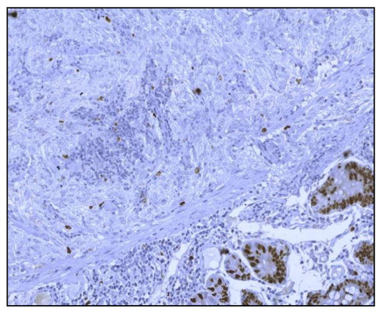 The histological examination of the specimen demonstrated an intramural small tumor −2 cm in diameter with intraluminal growth and obstruction. The final diagnosis was a high-grade ulcerated GIST with classic spindle cells, clear resection margins and no lymph node invasion (Figure 4). Mitotic activity was 12/50 on HPF (High-Power Fields). Ki67 proliferation marker labels 10% of the nuclei (Figure 5).