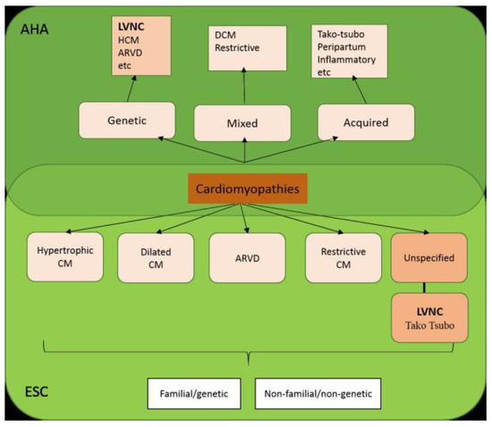 Classification of primary (predominantly involving the heart) cardiomyopathies according to ESC and AHA. AHA, American Heart Association; ARVD, Arrythmogenic right ventricle dysplasia; CM, cardiomyopathy; DCM, dilated cardiomyopathy; ESC, European Society of Cardiology; HCM, hypertrophic cardiomyopathy; LVNC, left ventricle non- compaction.