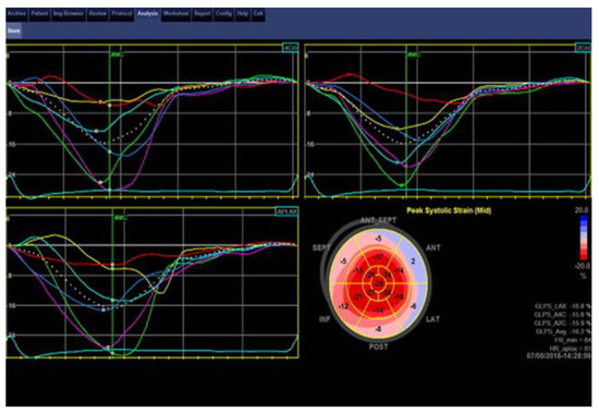 Speckle tracking echocardiography analysis, bull’s eye and regional strain curves (the same patient as in figure 2). Mildly decreased global longitudinal strain, with a value of -16.2%. Deformation is lower in the basal segments and normal in the midwall and apical segments. This may be explained by the globular shape of the LV and the presence of trabeculae in the apex.